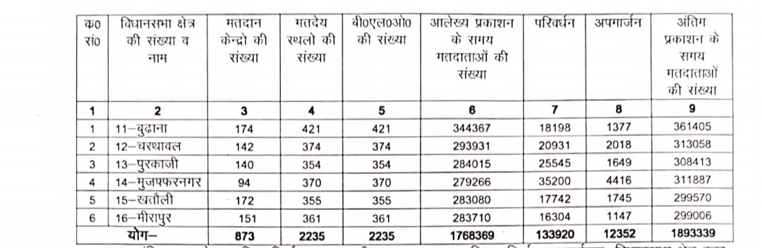 शुक्रवार को जनपद स्तर पर एवं विधानसभा निर्वाचन क्षेत्र स्तर पर निर्वाचक रजिस्ट्रीकरण अधिकारी कार्यालय में एवं प्रत्येक पदाभिहित स्थलों पर करा दिया गया है। अंतिम प्रकाशन के समय विधानसभावार मतदेय स्थल, मतदान केन्द्र, बूथ लेविल अधिकारी, परिवर्धन / अपमार्जन एवं अंतिम रूप से प्रकाशित मतदाताओं की संख्या निम्नवत् है विधानसभा क्षेत्र 11 बुढ़ाना में मतदान केदो की संख्या 174 मतदेय की संख्या 421 बी0एल 0ओ0 की संख्या 421 आलेख्य प्रकाशन के समय मतदाताओं की संख्या 34 43 67 परिवर्धन 18 198 अपमार्जन 1377 अंतिम प्रकाशन के समय मतदाताओं की संख्या 361405 है ।विधानसभा क्षेत्र 12 चरथावल में मतदान केंद्रों की संख्या 142 मतदेय स्थलों की संख्या 374 बी0एल0ओ0 की संख्या 374 आलेख्य प्रकाशन के समय मतदाताओं की संख्या 2939 31 परिवर्धन 20 931 अपमार्जन 2018 अंतिम प्रकाशन के समय मतदाताओं की संख्या 313058 है। विधानसभा क्षेत्र 13 पुरकाजी में मतदान केंद्रों की संख्या 140 मतदेय स्थलों की संख्या 354 बी0एल0ओ0 की संख्या 354 आलेख्य प्रशासन के समय मतदाताओं की संख्या 2840 15 परिवर्धन 25545 अपमार्जन 1649 अंतिम प्रकाशन के समय मतदाताओं की संख्या 308413 है। विधानसभा क्षेत्र 14 मुजफ्फरनगर मतदान केंद्रों की संख्या 94 मतदेय स्थलों की संख्या 370 बी0एल0ओ0 की संख्या 370 आलेख्य प्रशासन के समय मतदाताओं की संख्या 2792 66 परिवर्धन 35200 अपमार्जन 4416 अंतिम प्रकाशन के समय मतदाताओं की संख्या 311887 है। विधानसभा क्षेत्र 15 खतौली में मतदान केंद्रों की संख्या 172 मतदेय स्थलों की संख्या 355 बी0एल0ओ0 की संख्या 355 आलेख्य प्रशासन के समय मतदाताओं की संख्या 2830 80 परिवर्धन 17742 अपमार्जन 1745 अंतिम प्रशासन के समय मतदाताओं की संख्या 2995 70 है। विधानसभा क्षेत्र मीरापुर में मतदान केंद्रों की संख्या 151 मतदेय स्थलों की संख्या 361 बी0एल0ओ0 की संख्या 361 आलेख्य प्रकाशन के समय मतदाताओं की संख्या 2837 10 परिवर्धन 16304 अपमार्जन 1147 अंतिम प्रकाशन के समय मतदाताओं की संख्या 299006 है। 6 विधानसभा में कुल मतदान केंद्रों की संख्या 873, कुल मतदेय स्थलों की संख्या 2235, कुल बी0एल0ओ0 की संख्या 2235, कुल आलेख्य प्रशासन के समय मतदाताओं की संख्या 1768369, कुल परिवर्धन 133920 कुल अपमार्जन 12352, कुल अंतिम प्रकाशन के समय मतदाताओं की संख्या 1893 339 है।